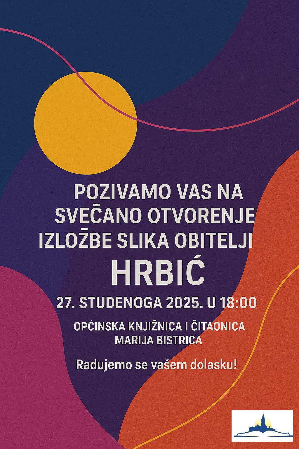 Pozivamo vas na svečano otvorenje izložbe slika obitelji Hrbić, u četvrtak 27. studenoga 2025. godine u 18:00 sati u Općinsku knjižnicu i čitaonicu Marija Bistrica. Slikarica