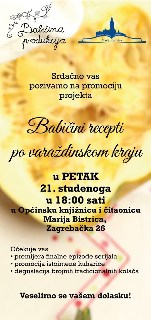 Pozivamo vas na premijeru i predstavljanje nove knjige i projekta ”Babičini recepti po varaždinskom kraju”, koji čuva i promiče kulinarsku baštinu varaždinskog kraja. Predstavljanje će