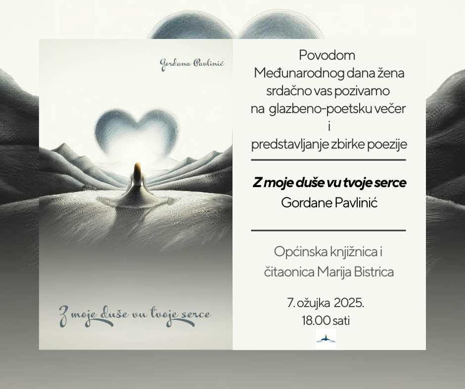Povodom Međunarodnog dana žena pozivamo vas na glazbeno- poetsku večer i predstavljanje zbirke poezije “Z moje duše vu tvoje serce” autorice Gordane Pavlinić. Gordana je