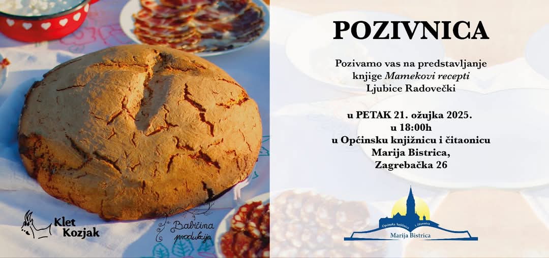 U Općinskoj knjižnici i čitaonici Marija Bistrica u petak, 21. ožujka s početkom u 18 sati predstavit će se knjiga ”Mamekovi recepti” autorice Ljubice Radovečki.